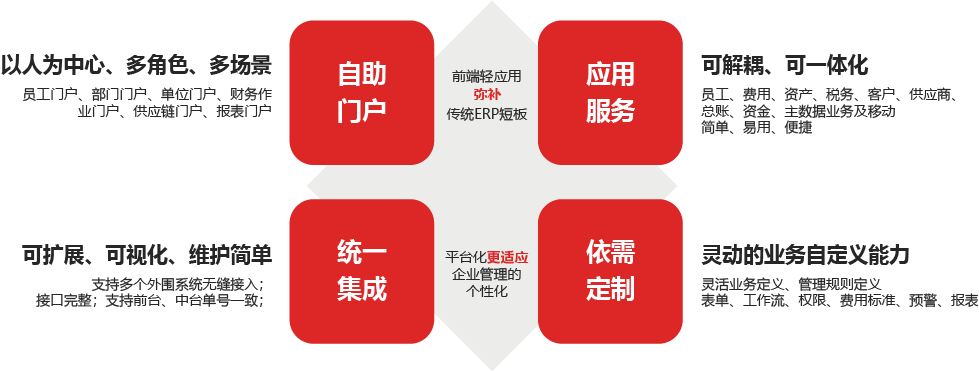 通過財務共享服務平臺系統(tǒng)的實施,建立集團統(tǒng)一財務共享平臺,實現(xiàn)自助門戶、主數(shù)據(jù)服務、管控規(guī)則定義、集團組織管理、預算、員工報銷、商旅服務、供應商、客戶、資金、稅務、總賬、審計監(jiān)督等一體化的工作中臺,同時實時與集團各公司協(xié)同辦公平臺、郵件系統(tǒng)、APP等無縫集成,實現(xiàn)集成化的共享服務平臺。