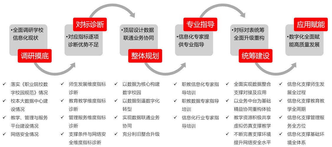 為應對標桿校建設任務,現提出綜合性解決方案:通過豐富拓展應用場景,加強信息基礎設施建設,拓寬數字教育資源供給,加大教育教學改革賦能力度,以提高數據治理能力,促進學校信息化建設全面升級為重點任務,根據教育部信息中心的標準,接入全國職業教育智慧大腦院校中臺,持續開展數據交互。通過建設校本數據中心,涵蓋基礎數據如辦學條件、專業設置、課程開設、學生信息、教師信息、企業信息等,構建校本綜合平臺,強化數據采集、匯聚和智能分析能力,提升數據治理水平,實現管理方式的全面轉變。推動差異化教育、個性化學習、精準管理、智能評價和虛擬實訓等現實需求的滿足,提升學校教育教學水平,為師生提供更多元的學習和教育服務,全面推動教育創新與發展。