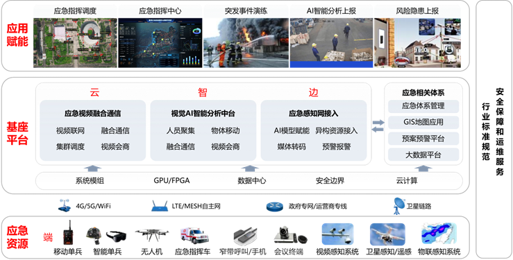 以安全保障和運維服務行業標準規范為基準,通過構建應急綜合指揮調度平臺體系管理不同業務的需求,在智能信息接報技術的支撐下實現對信息報送手段智能升級,提升事件初期處置效率,通過視覺AI智能分析中臺“端-邊-云”一體化智能識別,充分利用已有視頻資源,主動發現潛在風險,建立應急預案數字化編制中心,基于XR仿真技術研發的應急演練平臺,將各種應急預案進行數字化處理,實現快速、高效、科學、精準地指揮。